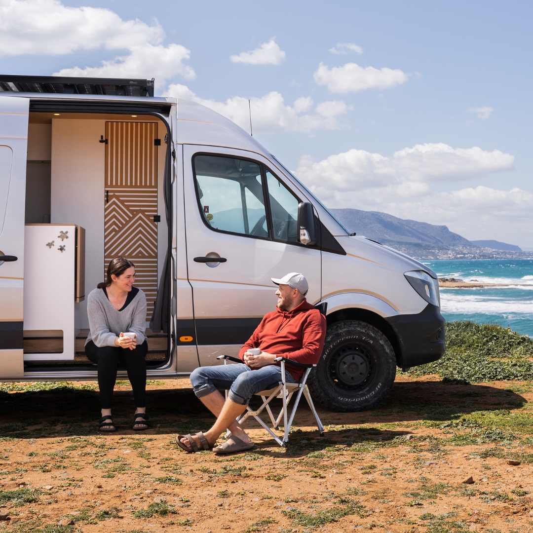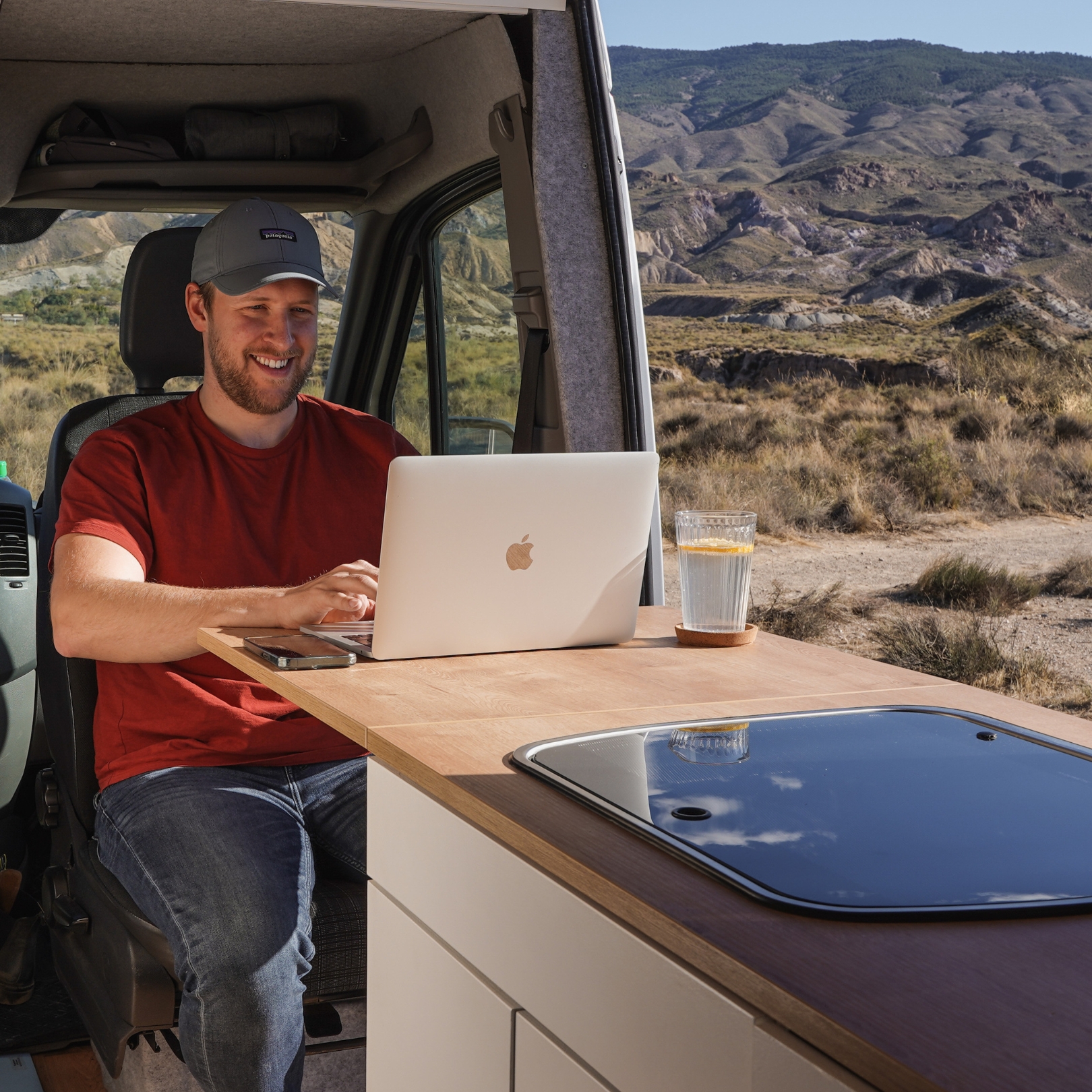 Unser Büro, Produktionsstudio und Meetingraum: unser Camper Sprinti, mit dem wir seit 2022 Vollzeit durch Europa reisen, aber auch regelmäßig für spannende Projekte in Deutschland vorbeischauen.